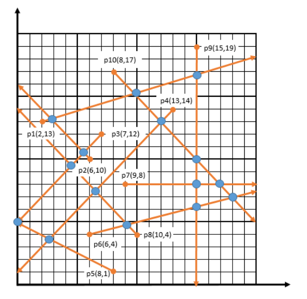 제한시간: 1000 ms 메모리제한: 128 MB 해결횟수: 8 회 시도횟수: 38 회 N개의 반직선이 2차원 평면에 주어진다. 반직선의 시작점은 0초과 L미만의 정수값을 갖는다. N개의 반직선중에 임의의 두 반직선이 만나는 경우의 수를 구하라. N개의 반직선의 시작점은 모두 다르다. 각 반직선은 시작점과 움직이는 방향점으로 표현된다. 두 반직선이 만나는 경우 만나는 점이(0, 0) ~ (L, L)에 위치한 경우만 유효한 것으로 간주한다.