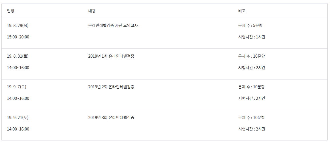 사. 인증서 발급 : 온라인레벨검증 3회 모두 참가한 인원에 대하여 산술 평균점을 기준으로 등급산출(절대평가) 및 온라인을 통한 인증서 발급