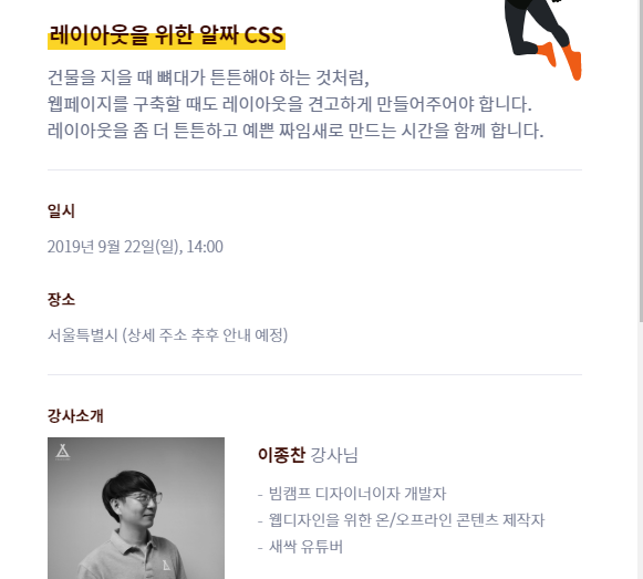 9월 22일에 서울에서 열리는 오프라인 특강에서는 다음과 같이 레이아웃을 위한 CSS 특강이 있습니다.