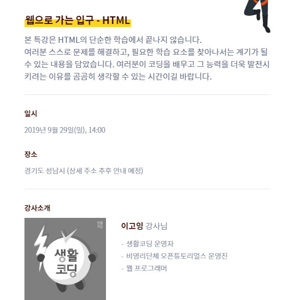 9월 29일 판교에서 예정인 특강 내용은 HTML에 관한 내용이네요.
